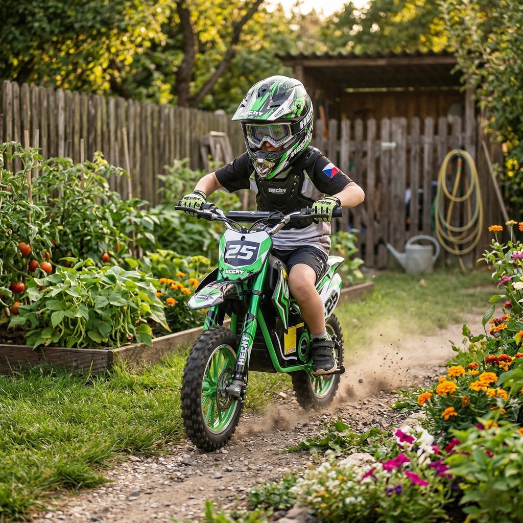 The base of the motorcycle consists of a quality steel frame complemented by stylish plastic covers that complete the look of a real motorcycle. The front wheel is mounted in a suspension fork, the rear wheel suspension is solved by central suspension, similar to real motocross machines. The aluminium alloy rims are shod in cross - enduro tyres, which provide optimum grip on hard surfaces, as well as in grass or on unpaved roads. Both front and rear wheels are equipped with disc brakes.