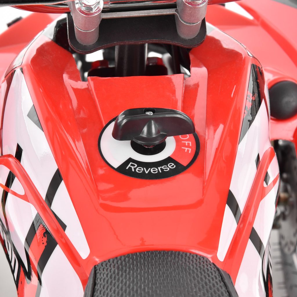 Electric ATV with 800 W engine. Power supplied by 36 V battery with 12 Ah capacity. Speed max. 20 - 25 km/h. Equipped with big 6" wheels. Weight 42 kg. Battery indicator, three speed switch, drive-chain. Max. driving range 13 - 18 km. Charging time 8 hours.