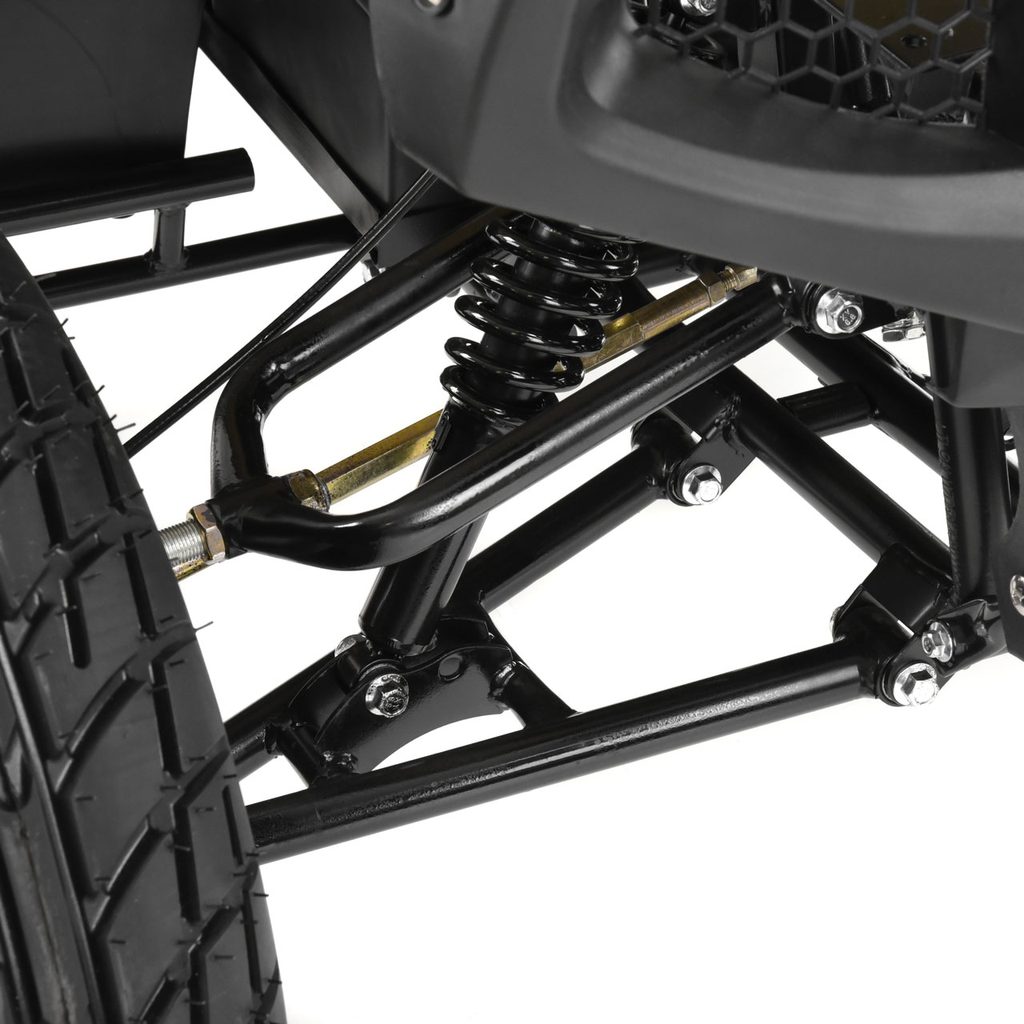 The quadricycle is equipped with front drum brakes and rear liquid disc brakes. the front drum brakes are operated by a lever on the handlebar, the rear liquid disc brakes are operated by a pedal, right foot. The motor is mounted on the rear suspension axle, the transmission from the motor to the axle is by means of a closed gearbox. The front wheels are on independently sprung suspension arms. Large tyres with rough tread are mounted on sophisticated aluminium rims, ensuring perfect traction even in rough terrain. A digital speedometer is mounted on the handlebars. The machine's predatory appearance and acceleration make it close to "adult" quad bikes with an internal combustion engine. The main advantage, however, is the completely silent and emission-free operation. It can therefore be operated even in places where noise or the smell of exhaust fumes could bother the surroundings.