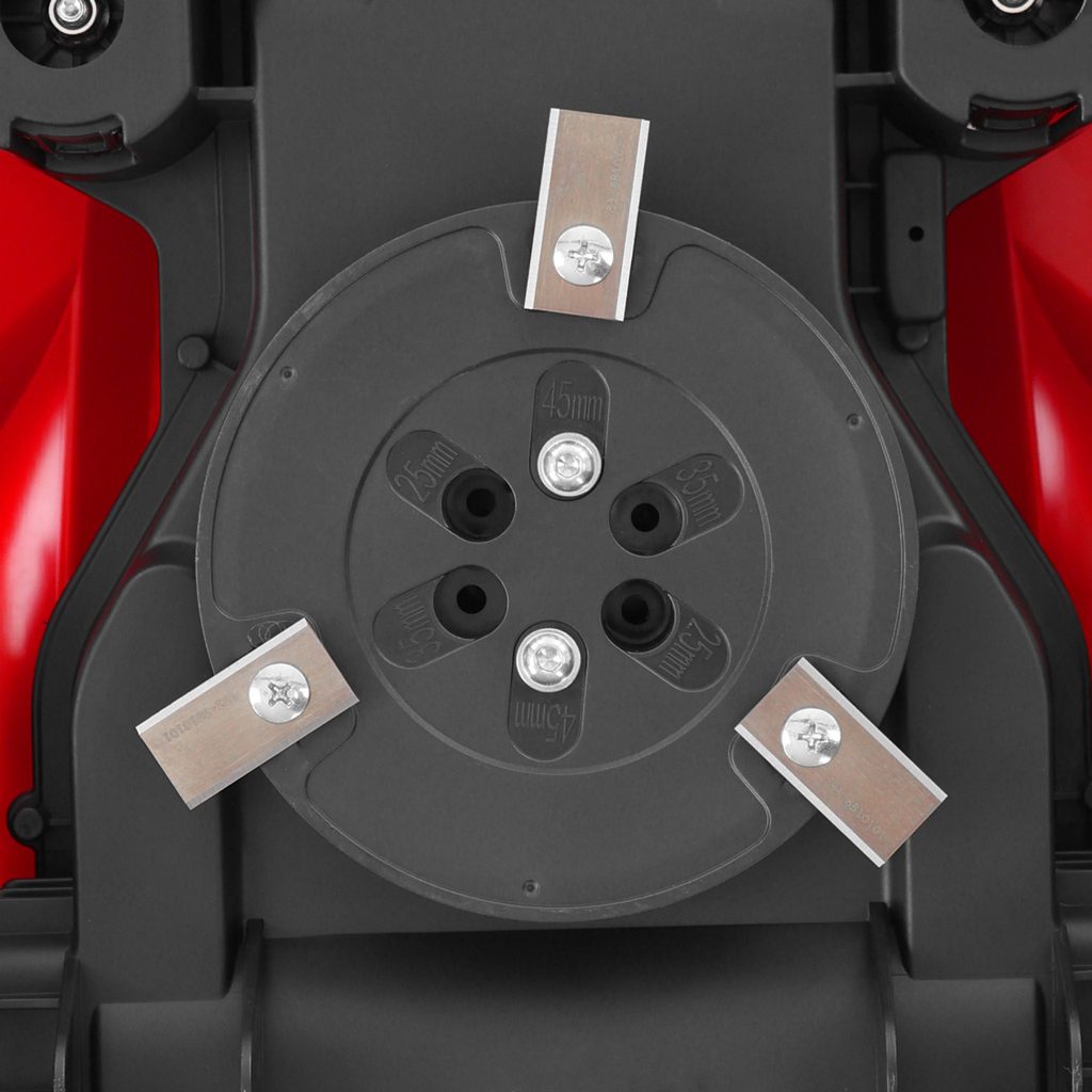 The mower is protected against theft by a PIN code. Without knowing it, the mower cannot be started, making it unusable for thieves. Completely hidden under the mower is a rotating head with a trio of blades, which could be dangerous if the mower is lifted or tipped over. Therefore, the machine is equipped with sensors to ensure that the blades stop immediately when the mower is lifted. For other unforeseen situations, the mower is equipped with a large button on the top cover that can also be used to stop it instantly at any time. The cutting height can be adjusted from 25 to 45 mm.