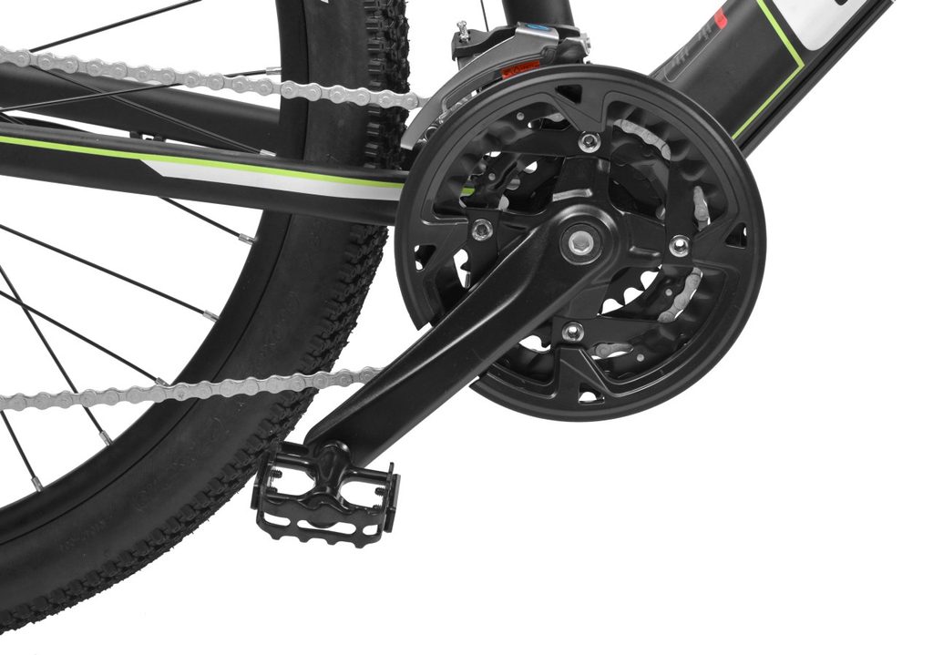 The HECHT GRIMIS is equipped with a SHIMANO shifter and derailleur, type Acera. The bike is equipped with three derailleurs and a seven-speed cassette (i.e. three-wheel front and seven-wheel rear).