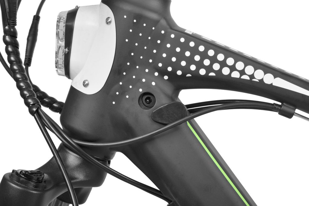 The Li-ion battery with SAMSUNG cells has a capacity of 7.8 Ah at 36 V. From full discharge, the battery is fully charged with the supplied charger (included) in approximately 5 hours. The maximum speed of the assisted bicycle is 25 km/h; once this speed is reached, the assistance is automatically deactivated and reactivated when the speed drops below 25 km/h. The bicycle thus complies with the road traffic conditions laid down in the current legislation for the Czech Republic and most other EU countries. The range of the assisted bicycle per charge is approximately 55 km. The distance is of course influenced by the rider's weight and the terrain. Of course, you can use the bike with the assistance switched off, but you must take into account that the integrated motor with gears in the rear hub puts a slight resistance when riding.