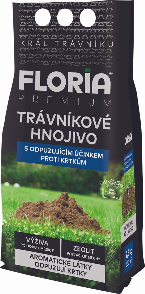 FLORIA Lawn Fertiliser with mole repellent properties is an excellent solution for achieving a molehill-free lawn. It contains all essential nutrients and is additionally enriched with magnesium, iron for deep green lawn colouring and zeolite. Aromatic substances contained in the zeolite repel moles from the grassed area. Zeolite also aerates the soil and suppresses moss occurrence. This special granulated lawn fertiliser is suitable for all types of lawns.