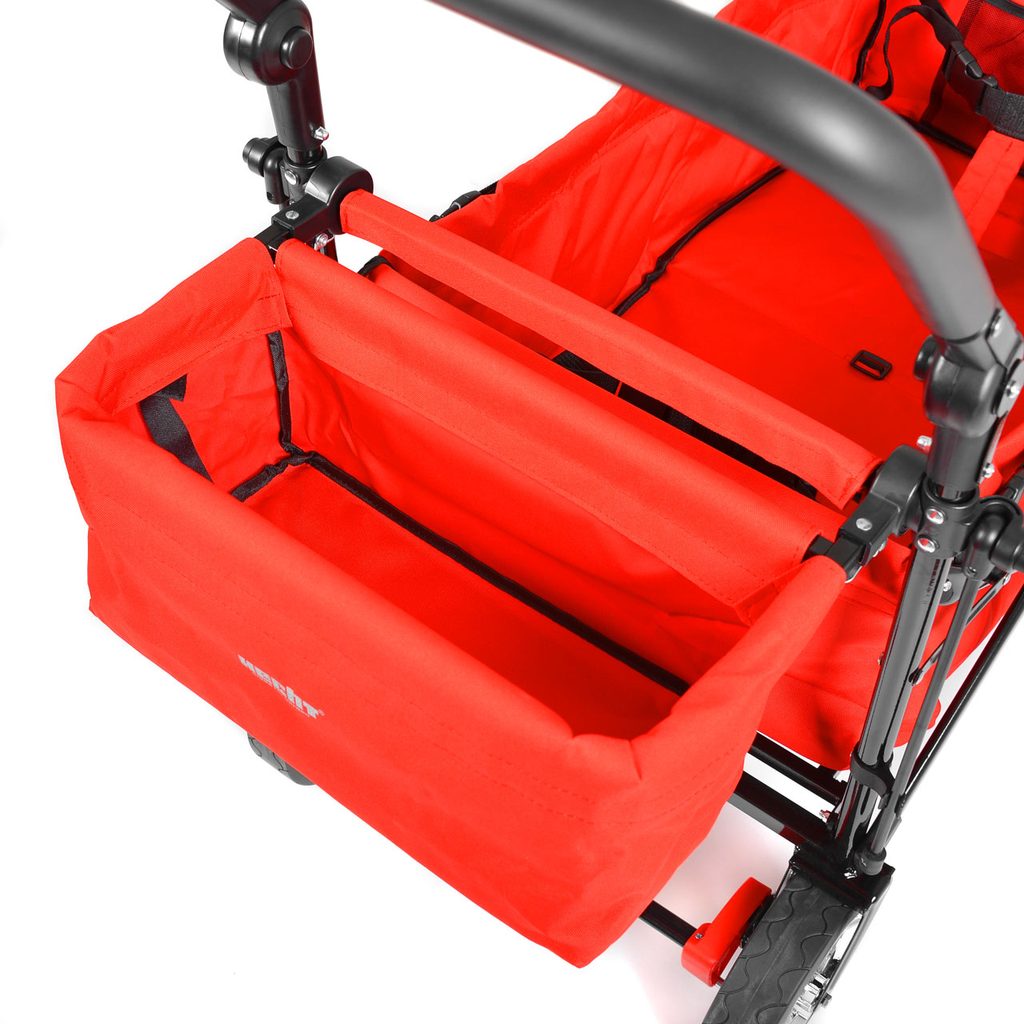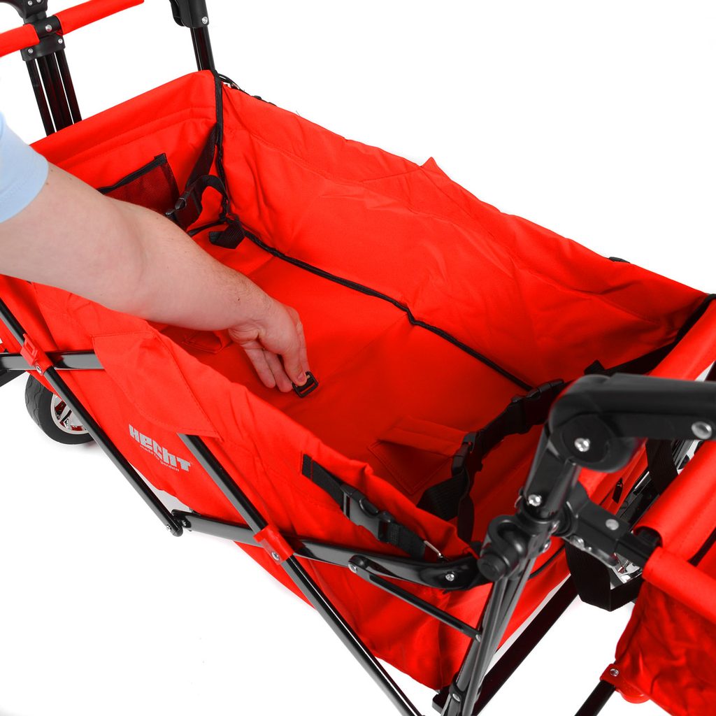 The HECHT 50006 leisure activity cart is the ideal solution for parents and families who want to spend time outdoors with their children. Thanks to its robust powder-coated steel frame and durable polyester cover, the cart is not only sturdy but also lightweight and easily portable. With a load capacity of up to 80 kg, it can accommodate children and their toys, and with two safety belts and front brakes, it ensures maximum safety during transport.