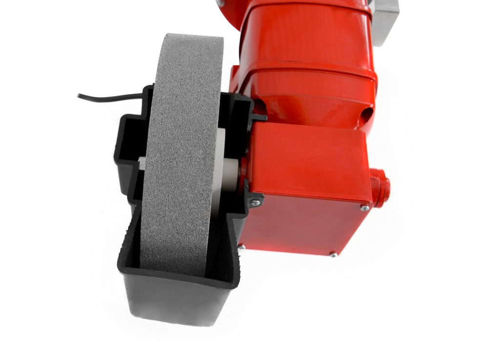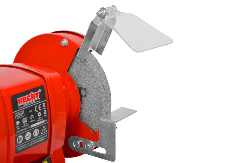 Electric powered bench grinder. Wet and dry grinding. Spark guard, workpiece support.