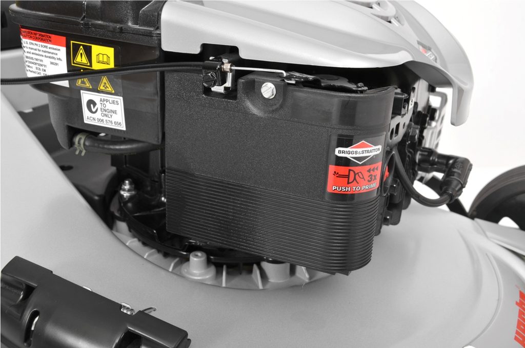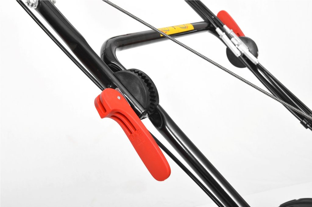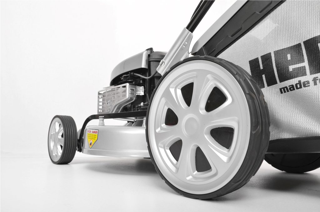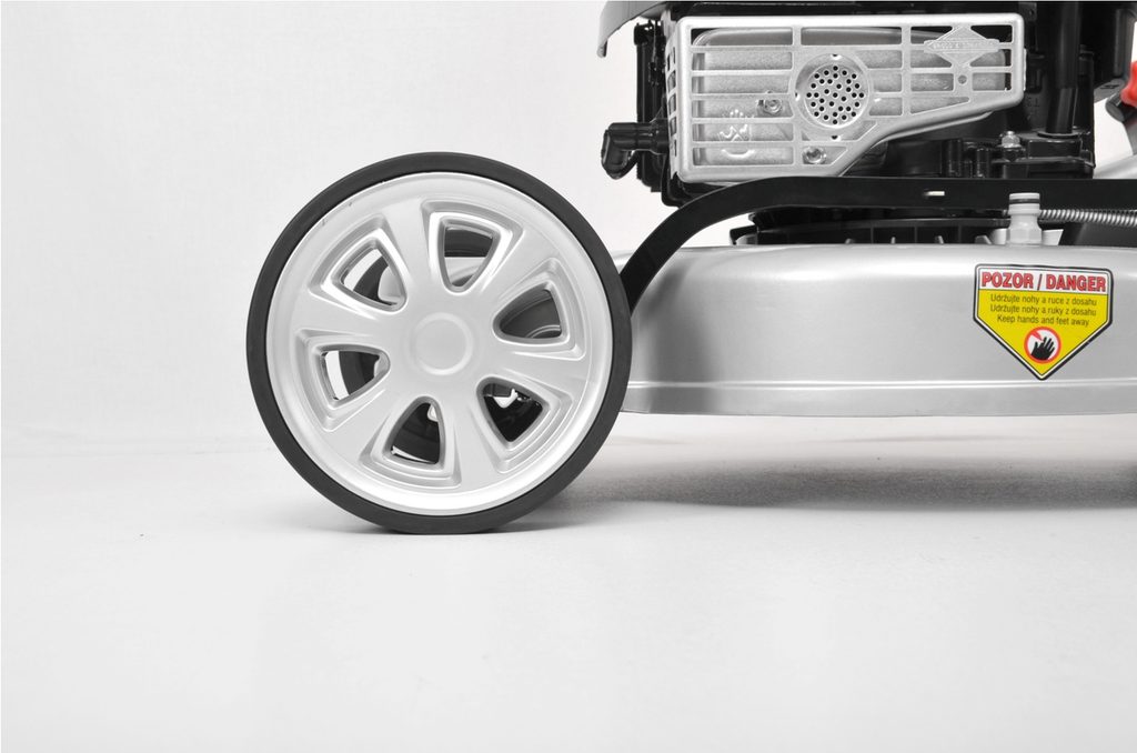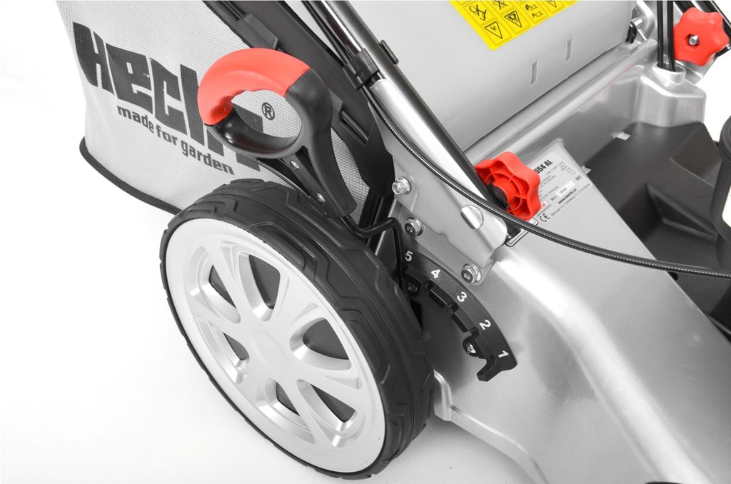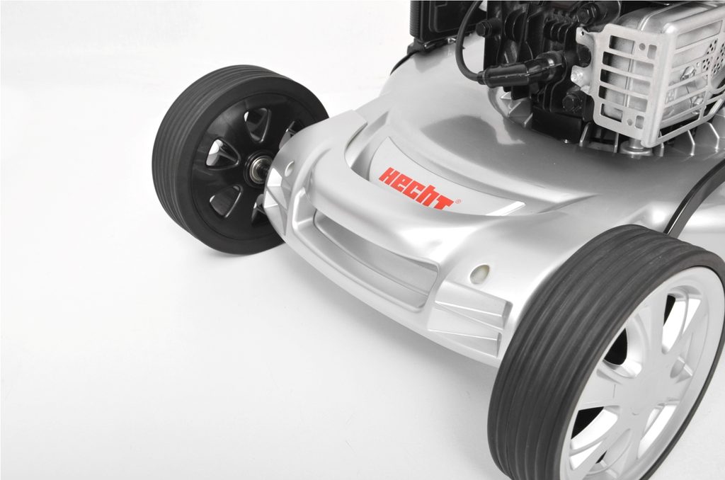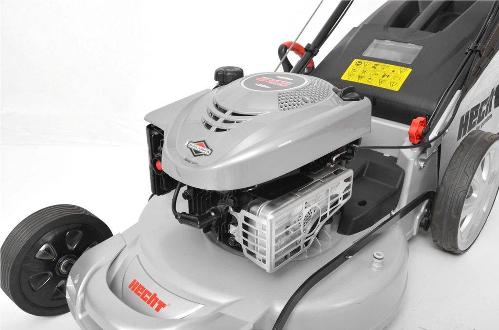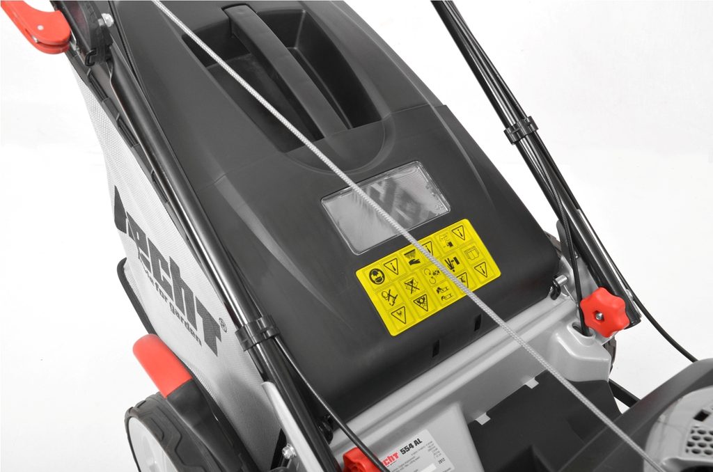 HECHT 554 AL 5 in 1 je moderní a dokonale vybavená benzínová sekačka s pojezdem. Robustní šasi této sekačky je vyrobeno s hliníkové slitiny, čímž bylo umožněno vytvoření skutečně stabilního základu pro sekačku při zachování příjemné hmotnosti. Výhodou této slitiny je i odolnost vůči korozi. Kola usazená na kuličkových ložiskách jsou opatřena gumovými obručemi s dezénem pro lepší trakci. Na zádech šasi přede kvalitní a svědčený motor Briggs & Stratton Series 625 o výkonu 5 HP a obsahu 190 ccm. Ten dodá dostatek výkonu nejen k pojezdu, ale i k pohonu ocelových nožů o záběru 510 mm. Výška sečení je centrálně nastavitelná v rozsahu 25 - 75 mm. Na výškově nastavitelné rukojeti jsou dobře dostupné všechny hlavní ovládací prvky sekačky. Polstrovaná rukojeť tlumí přenášení vibrací, praktický je i panel pod madlem s úložnými prostory pro drobnosti, nebo nápoje pro osvěžení při pauzách. Rukojeť lze i rychle složit pro úsporu místa při parkování. Zajímavou vlastností je i EDGE CUTTING, díky kterému je možné pohodlně sekat podle zdí a plotů.