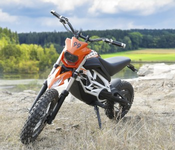 Pevný kovový rám je oblečen do stylových plastových krytů, které stroji dávají sportovní vzhled skutečného soutěžního motocyklu. Přední kolo o rozměru 2,5-12“ je uloženo v odpružené vidlici, konstrukce uložení zadního kola o rozměru 3 - 10" je řešena centrálním odpružením, podobně jako u skutečných motokrosových strojů. Přední i zadní brzdy jsou kotoučové, mechanické. Široká racingová řídítka (tzv. hrazdy) zajistí pohodlné ovládání. Pro zvýšení bezpečnosti jsou doplněna ve střední části o měkčený pěnový kryt.