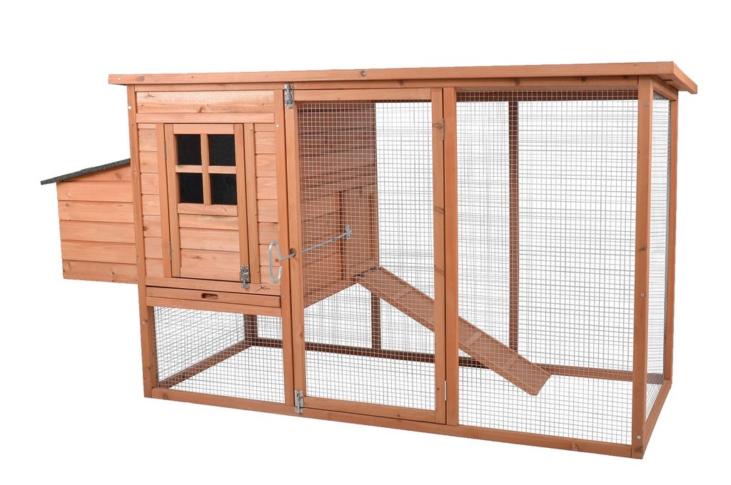 Henhouse with paddock without ground wires. Possibility of locking over night. Made of durable fir wood. Roof covered with asphalt shingle Dimensions (L x W x H): 201 x 68 x 102 cm.