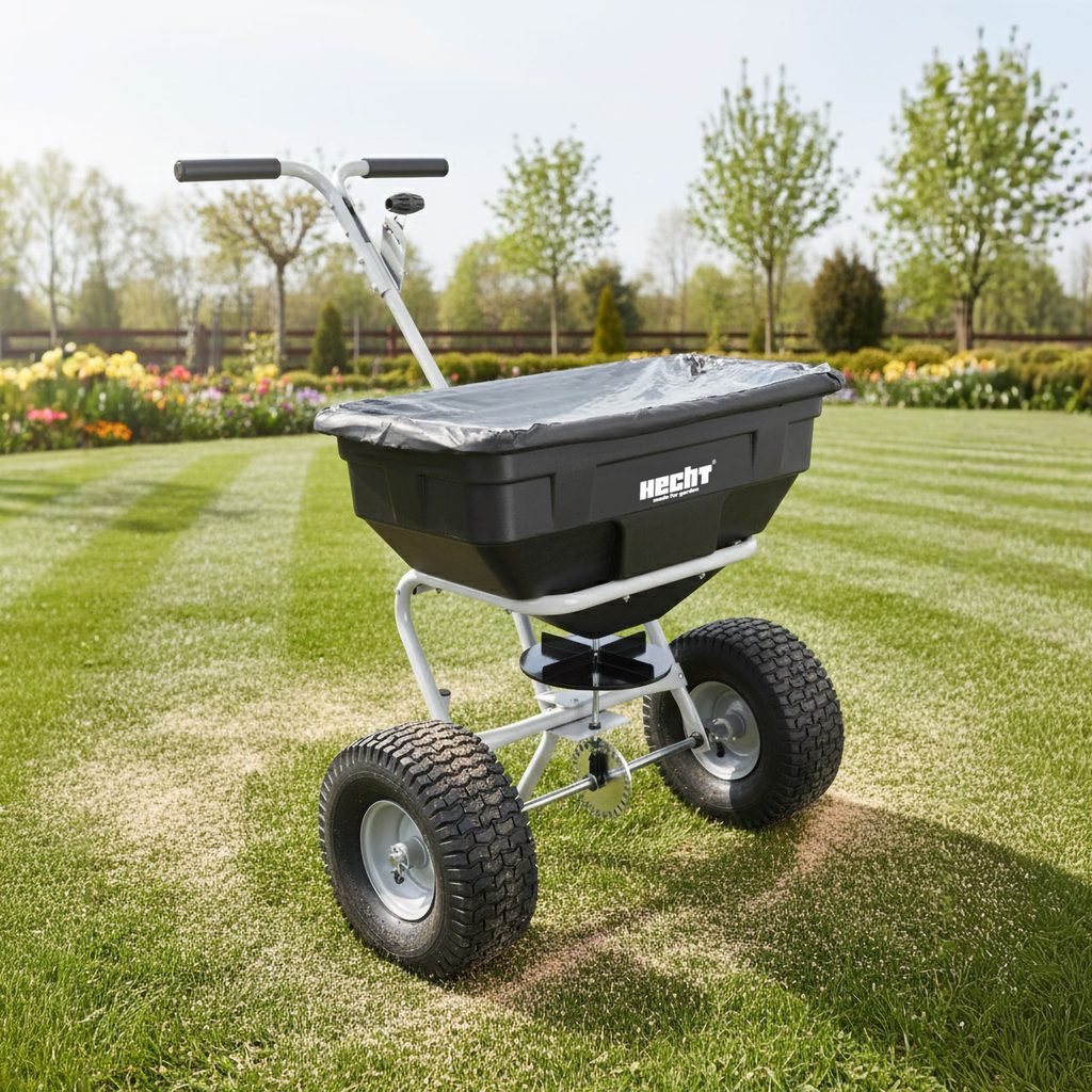 Manual spreader with tank volume of 60 litres. Designed for distribution of tertilizers and seeds, in winter even salt. Adjustment of distribution volume at grip.
