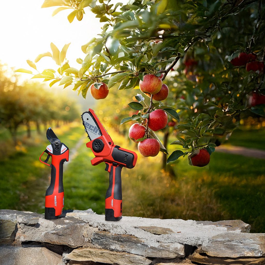 Battery-powered pruning shears allow effortless cutting of branches up to 32 mm in diameter. Where shears fall short, the battery-powered chain saw with a 10 cm long bar easily takes over. Two batteries and a charger are included in the package.