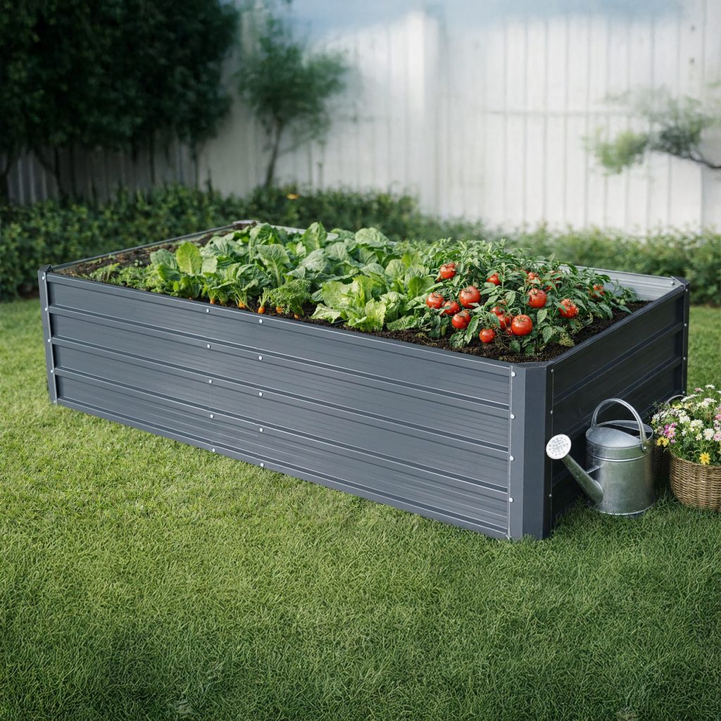 The bed has overall dimensions of 180 × 90 × 47 cm, which provides ample space for growing various types of crops. The construction is made from galvanised steel with a sheet thickness of 0.3 / 0.6 mm, which ensures good corrosion resistance and long service life for outdoor use. The sturdy construction also maintains the shape of the bed and prevents soil from sliding.