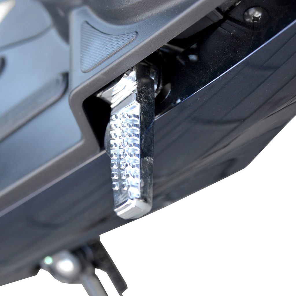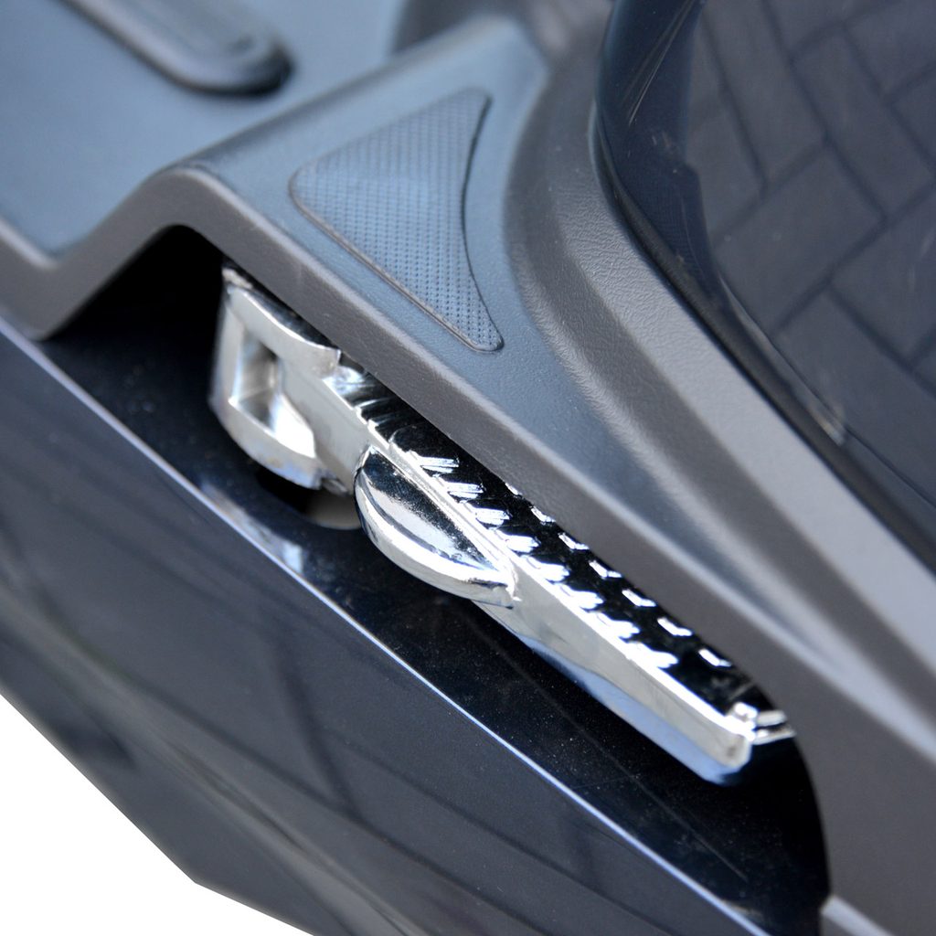 Under the handlebars in the footwell is a practical luggage hook and a small space with a lock to store small items. Not to be missed is the large and comfortable seat. At the front under the seat there is a connector for connecting the charger, on the sides there are folding footrests for passengers.