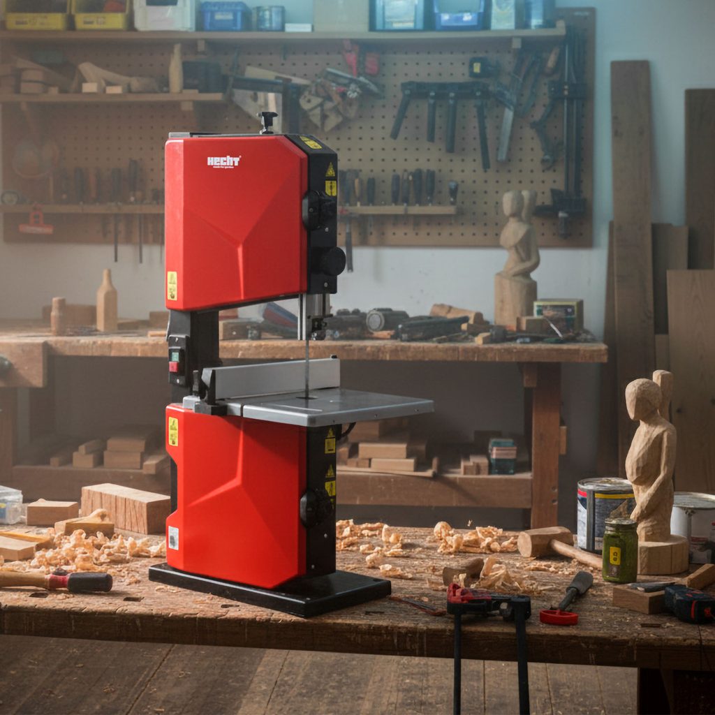 Table band saw, power consumption 500 W. Worktop 302 x 304 mm, saw blade length 1713 mm. Weight 24 kg.