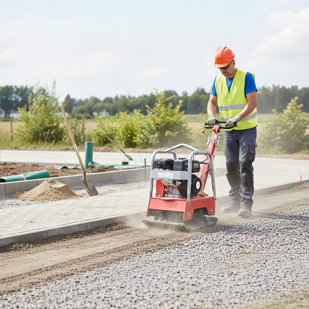 For ease of transport, the HECHT 1116 vibratory plate is equipped with transport wheels and a rubber pad, which are included in the package. This model is ideal for construction companies, landscaping and private use where reliable and efficient compaction is required.
