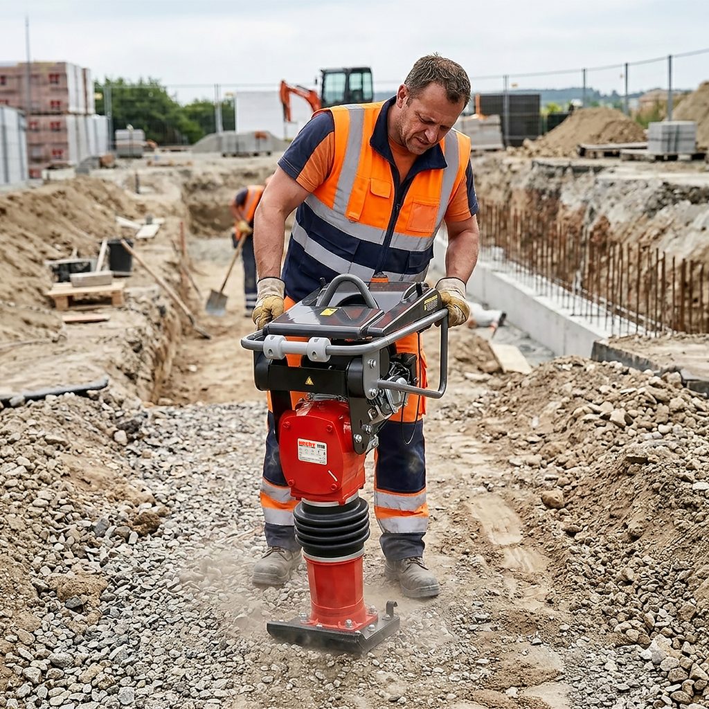 Motor vibrating rammer with a motor with a volume of 196 cm3. Board size 33.5 x 27.5 cm. Weight 82 kg.
