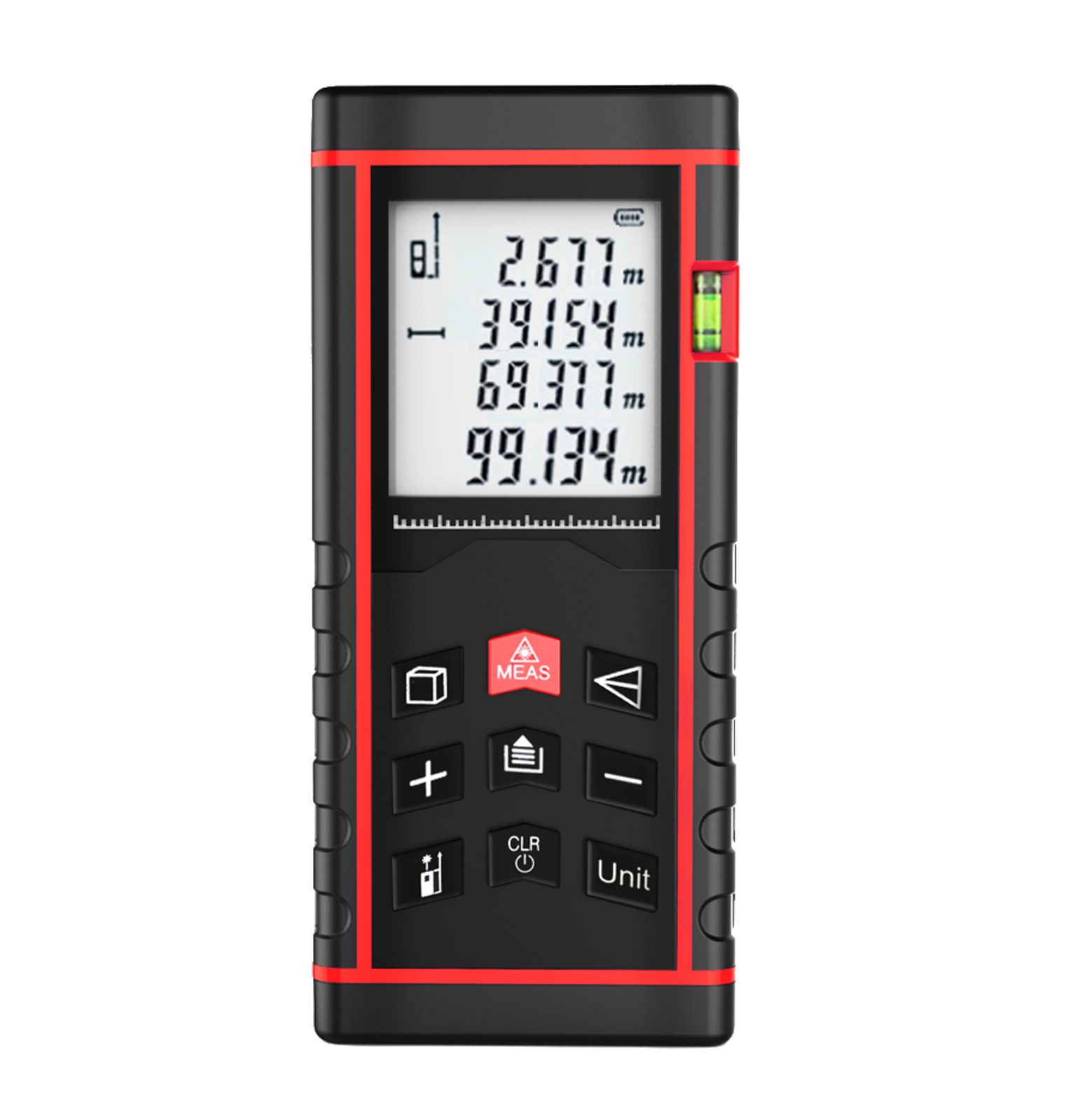 Laser distance measurer with a measuring range of 0.05-50 m. Basic and advanced measurement with area, volume and other functions.